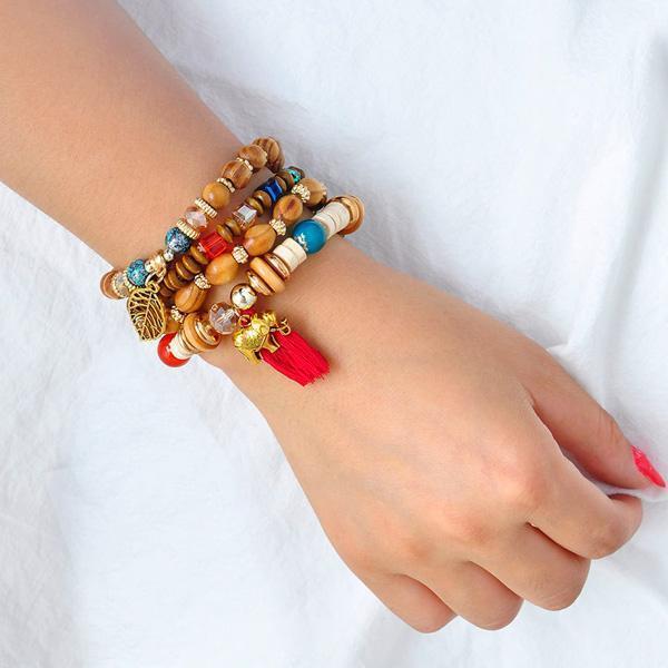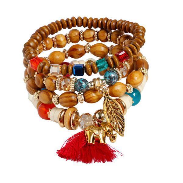 - 4 tier bohemian style bracelet featuring an adorable elephant, tassels and threaded with wooden beads.
