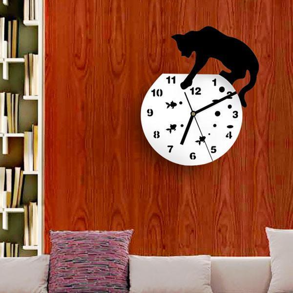 • Fishbowl Cat Wall Clock depicts a playful kitty dipping its paw into a goldfish bowl