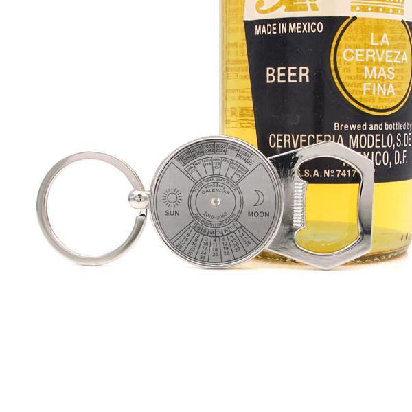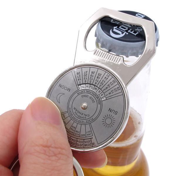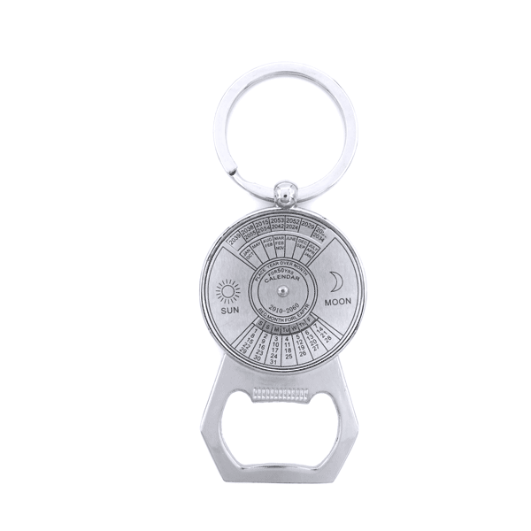 Pocket-sized key ring calendar that resembles an Astrolabe. The Perpetual Calendar Bottle Opener displays days and dates for the next 50 years, will open your bottle cap and is small enough to conveniently keep in your pocket. What day will your birthday be on in the year 2039? The dial rotates to display any date in the next 50 years, all you do is line up the month with the year.